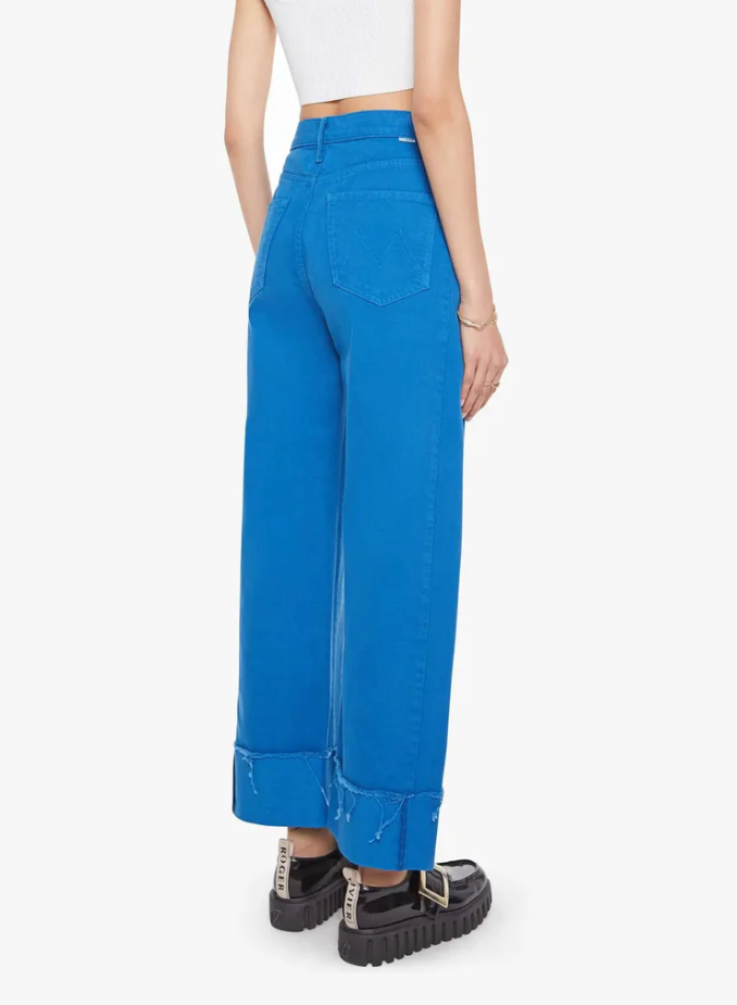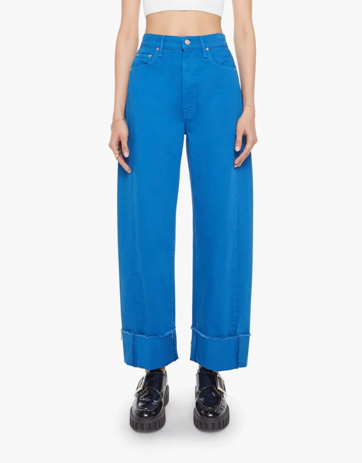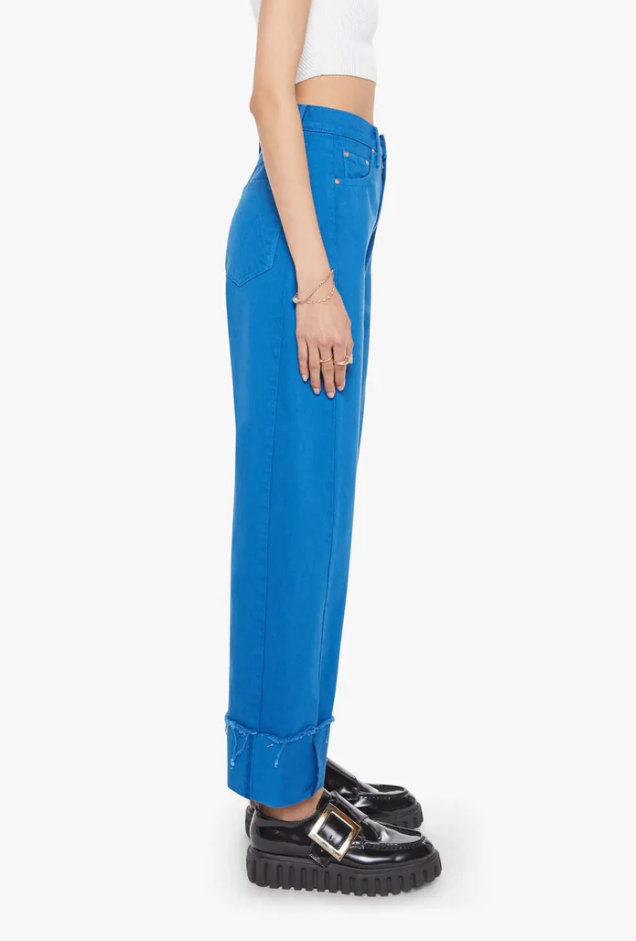 A super high-waisted pant with a zip fly, wide, curved leg and an ankle-length inseam with a cuffed, frayed hem. Made from rigid SUPERIOR denim, the pants are designed in bright blue.