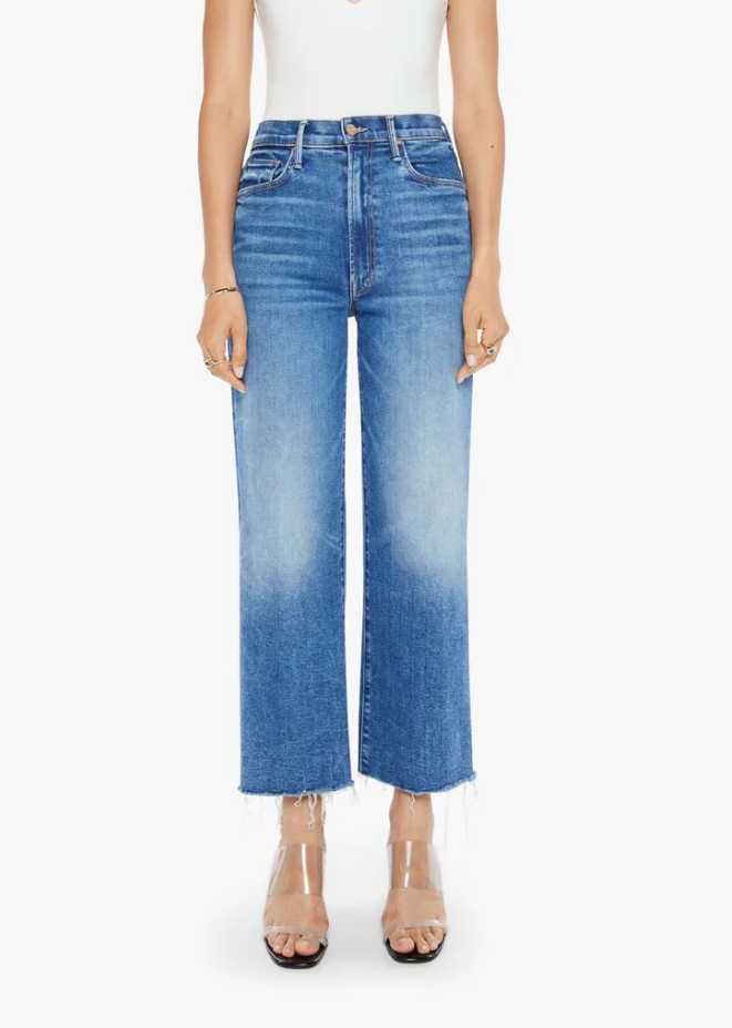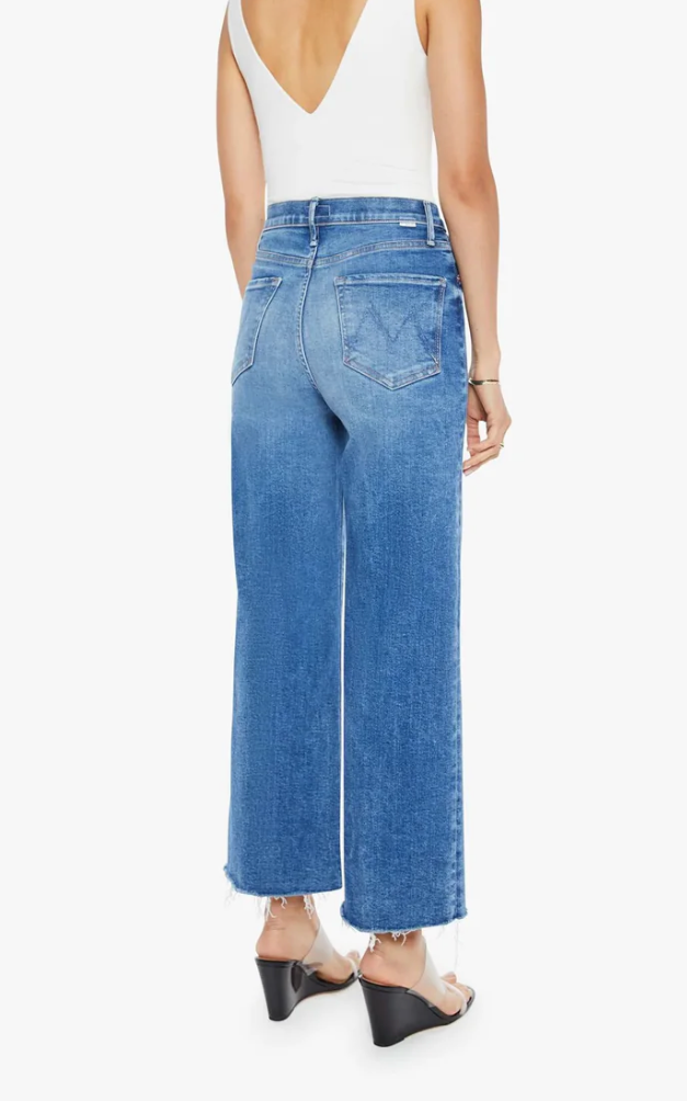 Radical. High-rise jeans with a loose fit, wide leg and ankle-length inseam with a frayed hem. Cut from stretch denim, Bitchin' is a mid-blue with whiskering and fading at the knee.