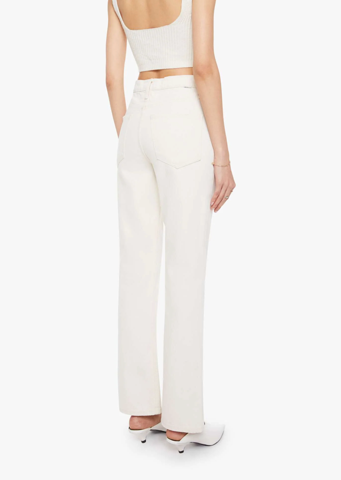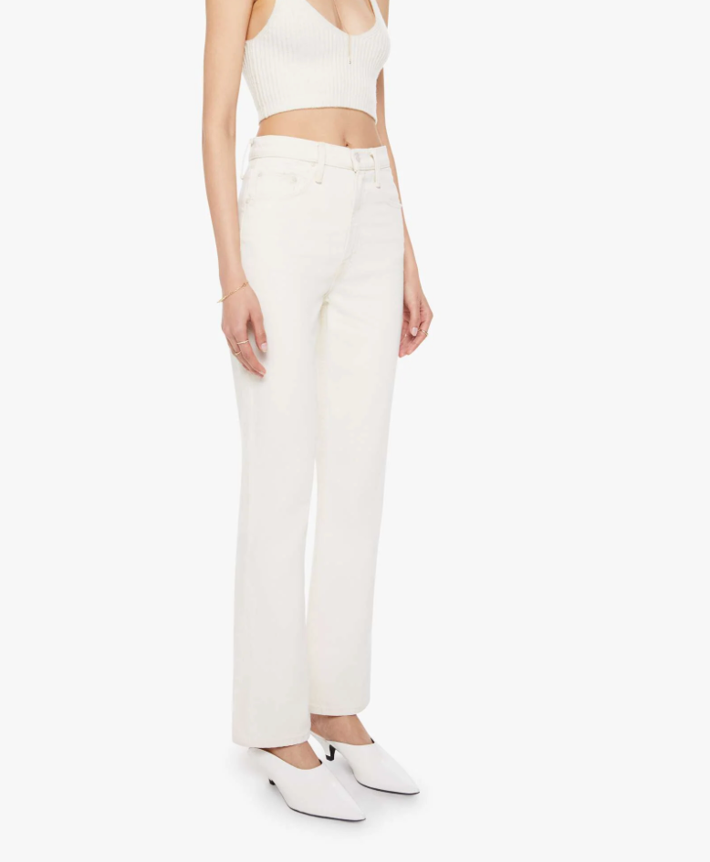 Designed to sit on the hips with a slouchy fit, these jeans feature a flared leg, zip fly, a 32.75-inch inseam and a super high rise with a slightly dropped crotch. Cut from rigid SUPERIOR cotton, Natural Selection is a creamy white with tonal hardware.