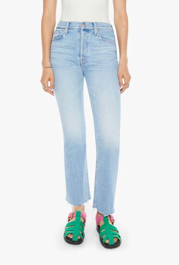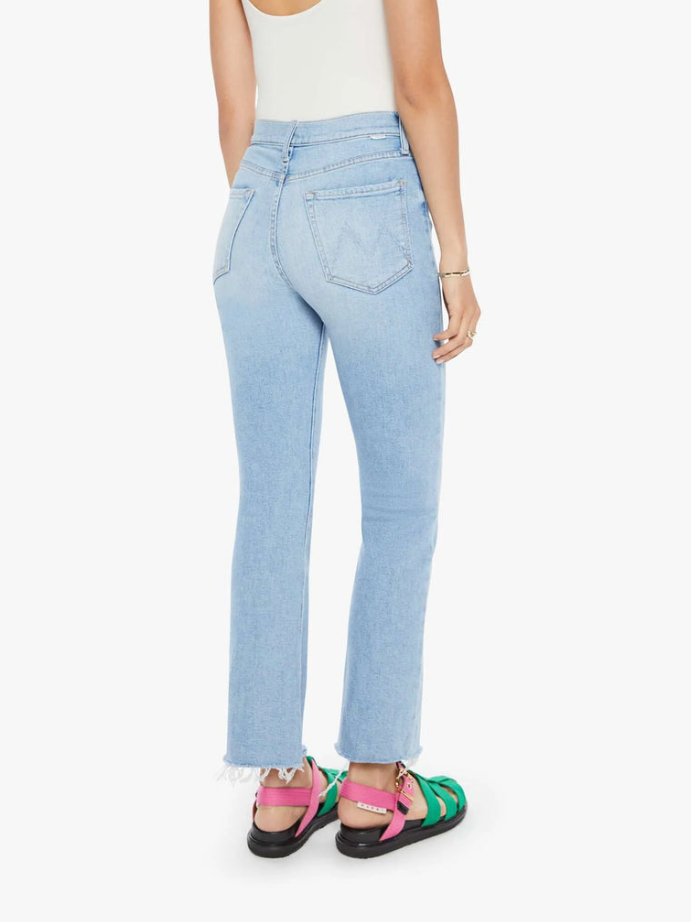 Born to ride. A high-rise flare with a button fly and 28.25-inch inseam with a frayed hem. Made from stretch denim, Look Ma, No Hands! is a light-blue with whiskering and fading at the knee.