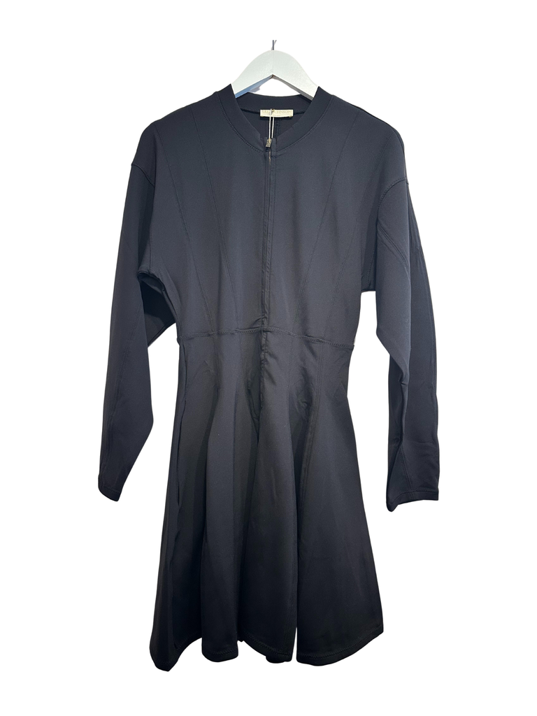 Arriving in Look 51 on the AW25 runway, the Ansel Dress is cut from double-faced stretch scuba, a soft fabrication that keeps its shape while offering a comfortable fit. This black mini dress features a sculptural silhouette with voluminous sleeves and a defined waist that flares at the hem with godet pleating.