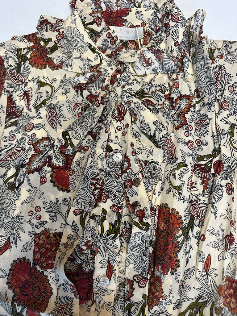 The Catroux Blouse is adorned with 19th century-inspired French florals enriched with graphic engravings. Crafted from signature silk crepe de chine, this multicolored top is imbued with poetic detailing, with frills at the collar and fluted cuffs.