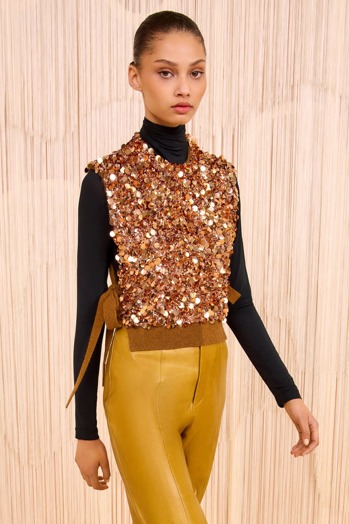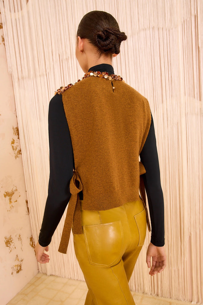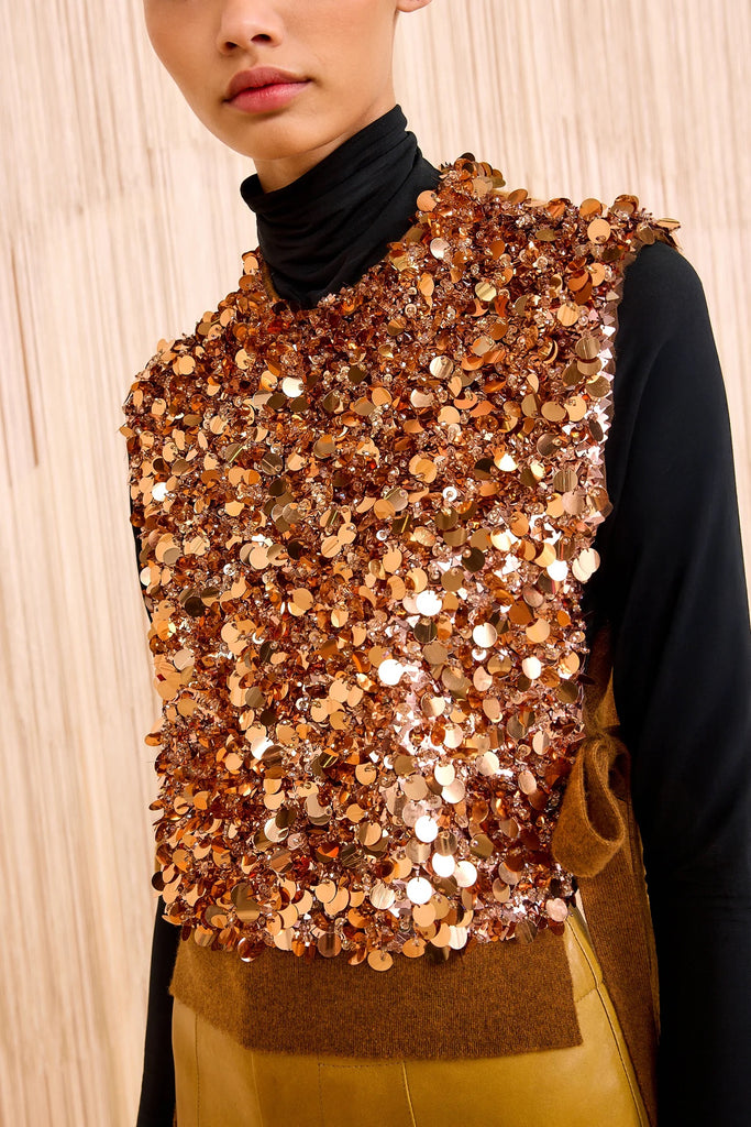 As seen in Look 26 on the AW25 runway, the Cosima Vest is spun from impeccably soft brown cashmere embellished with shimmering beads and paillettes. This sleeveless vest contrasts beautifully with its flickering sequins and ribbed waist, creating a stunning effect for layering or wearing on its own.