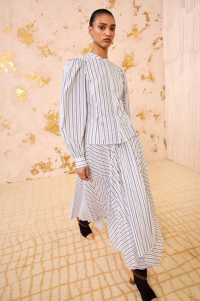 Imbued with subtle dimension, the Cybil Blouse is defined by architectural sleeves and scalloping that traces the bodice. The classic blue and gradient stripes make this cotton blouse a refined wardrobe staple.