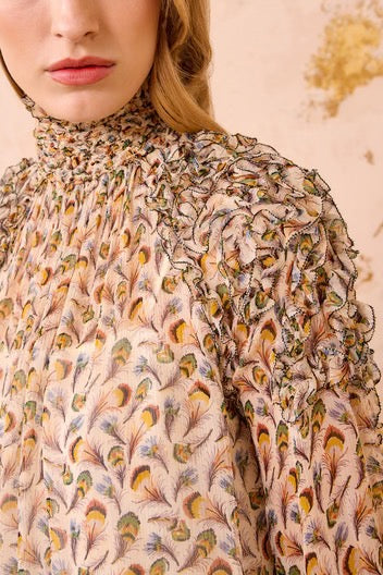 The Magdalena Blouse is cut from crinkled chiffon that’s weightless with an airy texture. This classic printed top features smocking and micro ruffles along the neckline and shoulders, and blouson sleeves that elegantly billow.