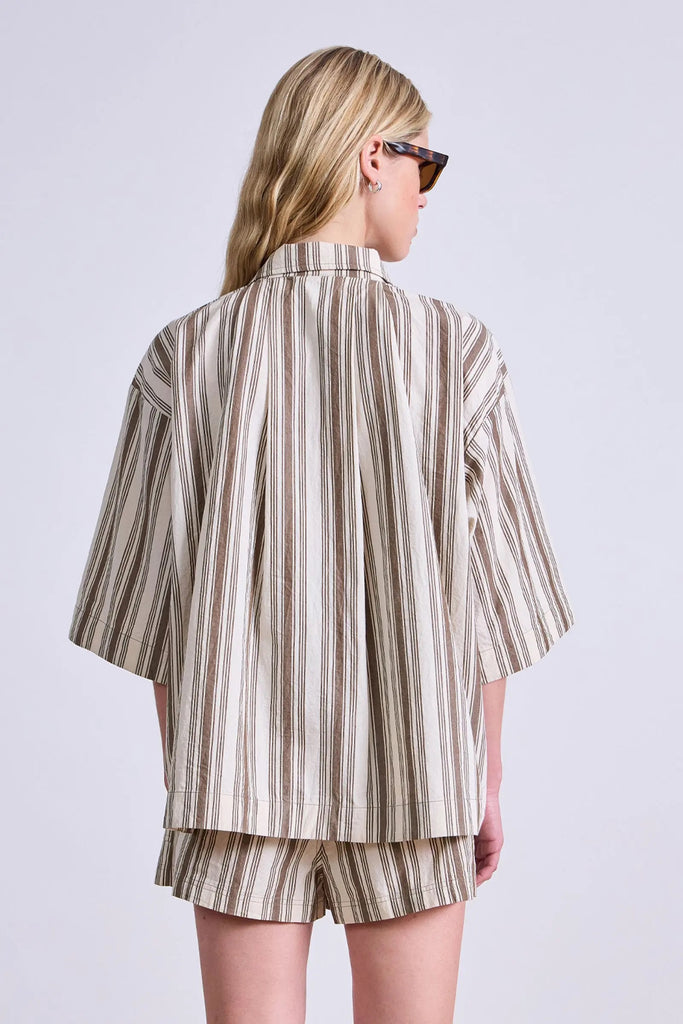- Boxy silhouette, shirt collar, center front slit, front button closures, short sleeves, dropped shoulder