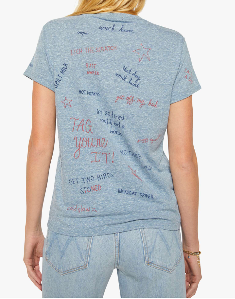 It says without going. A soft crewneck with a slim fit for a vintage look and feel. Made from a cotton blend in overdyed blue, The Boxy Goodie Goodie in Tongue Tied features printed text in red, yellow and blue throughout.