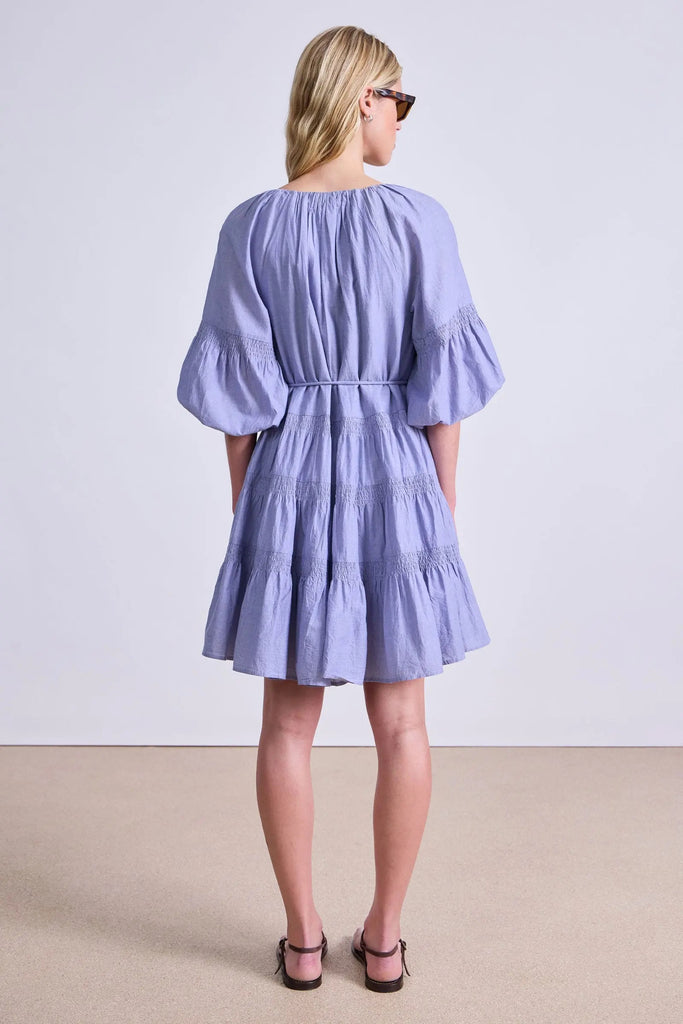 - Center front slit, raglan puff sleeves, tiered skirt, removable self tie belt included