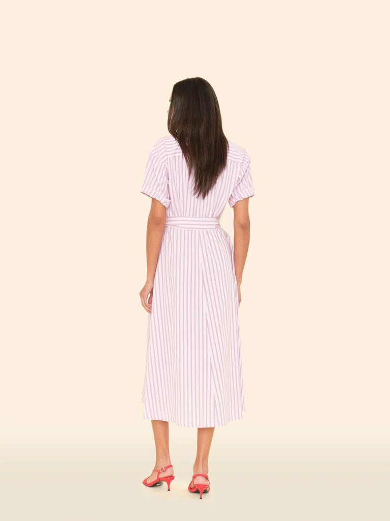 Earn your stripes. Liora is updated this season in our lightweight cotton stripe. Liora is an a-line midi shirtdress with a band collar, V-neck, button-front, rolled sleeves, back yoke, optional self-tie belt with belt loops, and side seam pockets.