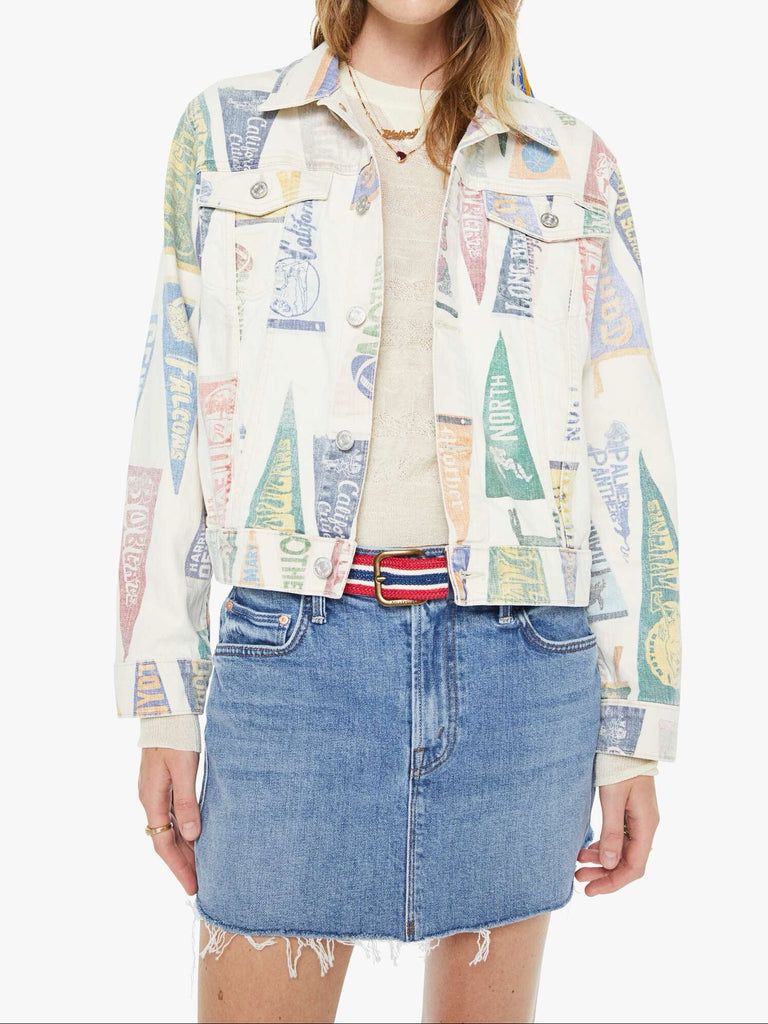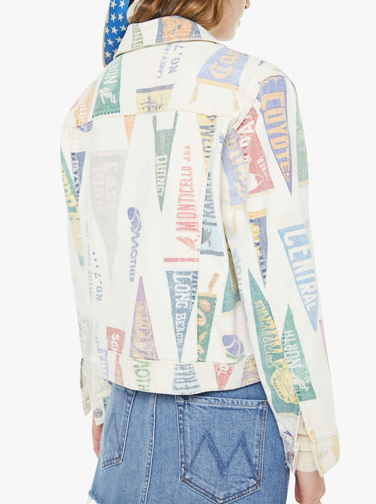 School spirit. A classic button-up jacket with front patch pockets and a slightly cropped fit. Made from semi-rigid SUPERIOR cotton, Pep Rally is an off-white with a faded pennant print throughout. 98% Cotton 2% Elastane