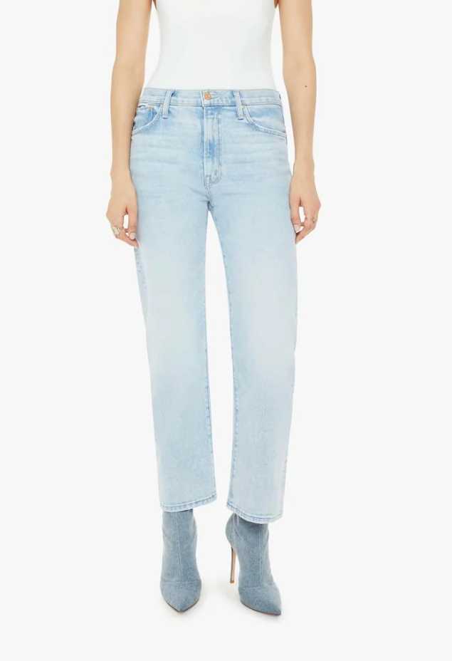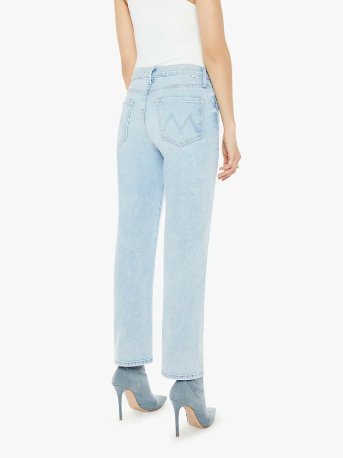 Calling all spirits. Straight-leg jeans with a zip fly, ankle-length inseam, slightly dropped crotch and a slouchier fit designed to sit on the hips. Made from denim with a touch of stretch, Light As A Feather is a light blue wash with whiskering and fading at the knee.