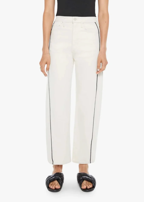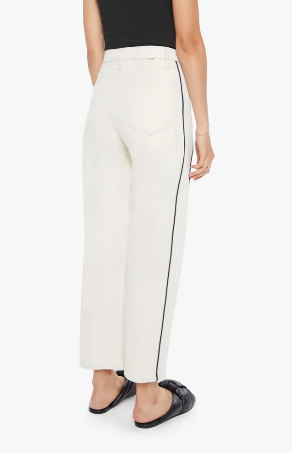 Au naturel. A super high-waisted jean with a wide, curved leg, an ankle-length inseam and a clean hem. Cut from a SUPERIOR cotton blend with a touch of stretch, Act Natural is a creamy white with tonal hardware and a black pinstripe down the outer seam.